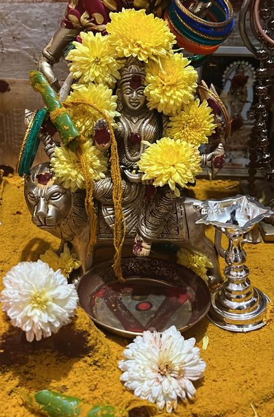 Throughout the nine days, priests and devotees read the Durga Saptashati / Devi Mahatmyam, recounting the victories of the goddess over demons like Mahishasura, Shumbha, and Nishumbha. Listening or reading this grants inner courage, spiritual merit, and cleansing of past karmas.